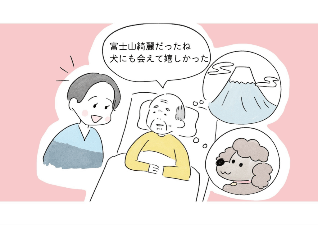 快晴の空の下、馴染みのおでん屋さんやご自宅に立ち寄り、大好きな愛犬とも再会することができました。富士山を望む車中で、患者さんは穏やかな表情を見せ、「気持ちいいね〜」と微笑まれました。ドライブ中には病棟で見られたような声を出す場面は一度もなく、帰院後も「富士山がきれいだったね」と繰り返し話されていたのがとても印象的でした。