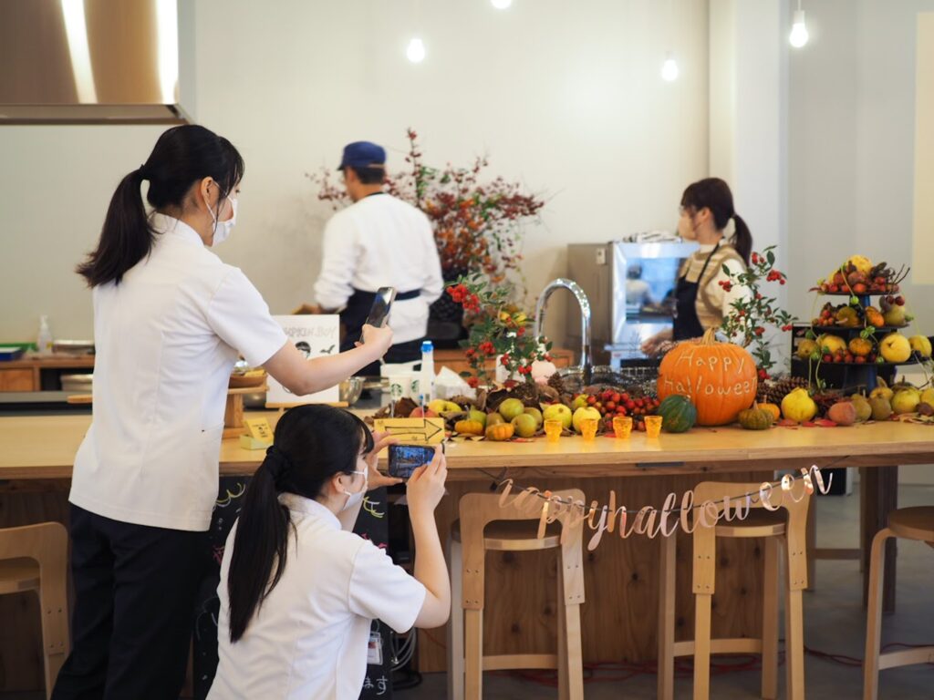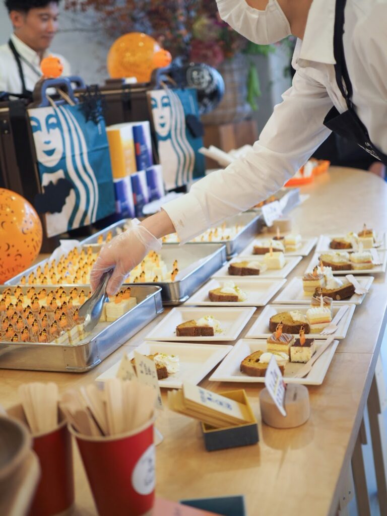 スターバックス 二子玉川ライズ ドッグウッドプラザ店の皆さま、APPLEBOY(鈴木麟太郎)さんなどの地域に関わるゲストをお迎えしました。焼きたてのかぼちゃパウンドケーキや栄養部スタッフによるスイーツ、スターバックスさんのコーヒー・紅茶を囲み、ゲストや職員同士の会話が自然に生まれるくつろぎのティータイムに。