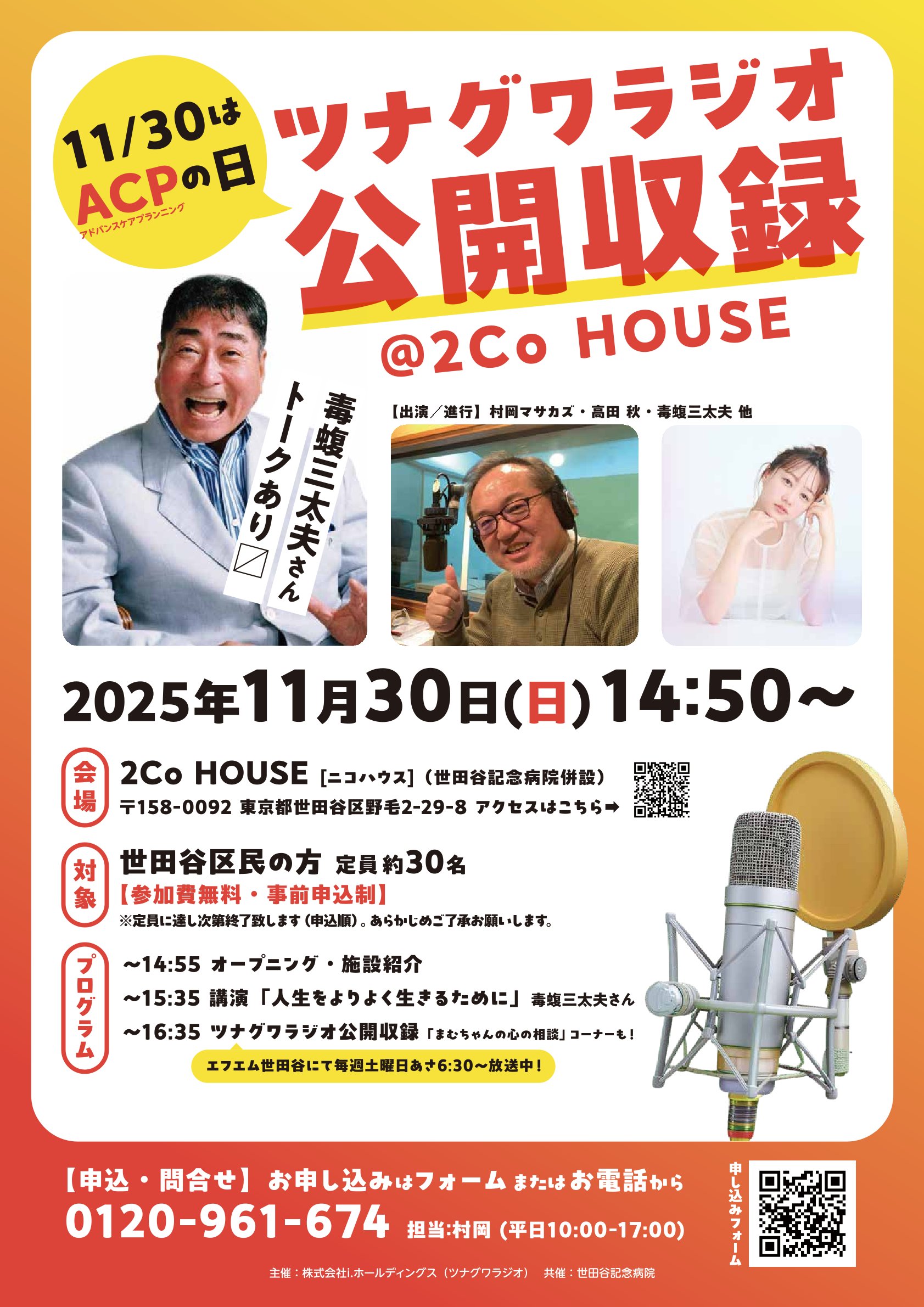 世田谷記念病院にて、地域の皆さまに向けて「ACP(アドバンス・ケア・プランニング)※」への理解促進と、地域とのつながりを深めることを目的に、エフエム世田谷で放送中のラジオ番組「ツナグワラジオ」と共同イベントを開催します。人情味あふれる毒舌で人気の毒蝮三太夫さんの特別公演もあります。