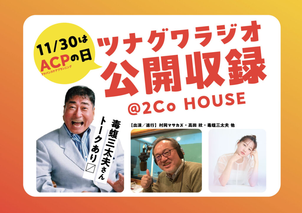 「ツナグワラジオ」(FM83.4MHz)は、毎週土曜日の朝6時30分から放送されている介護・終活・ACPに関する情報番組で、パーソナリティは村岡マサカズさんと高田秋さんが務めています。
