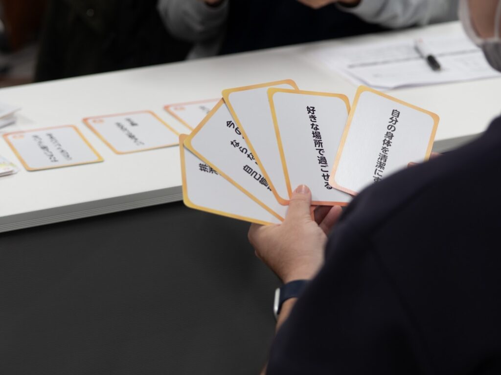 …など、「こんな状態で過ごせたら自分らしい」と感じる言葉が書かれたカードを選びながら、自分にとって大切なことを整理し、他の人と共有していくカードゲームです。