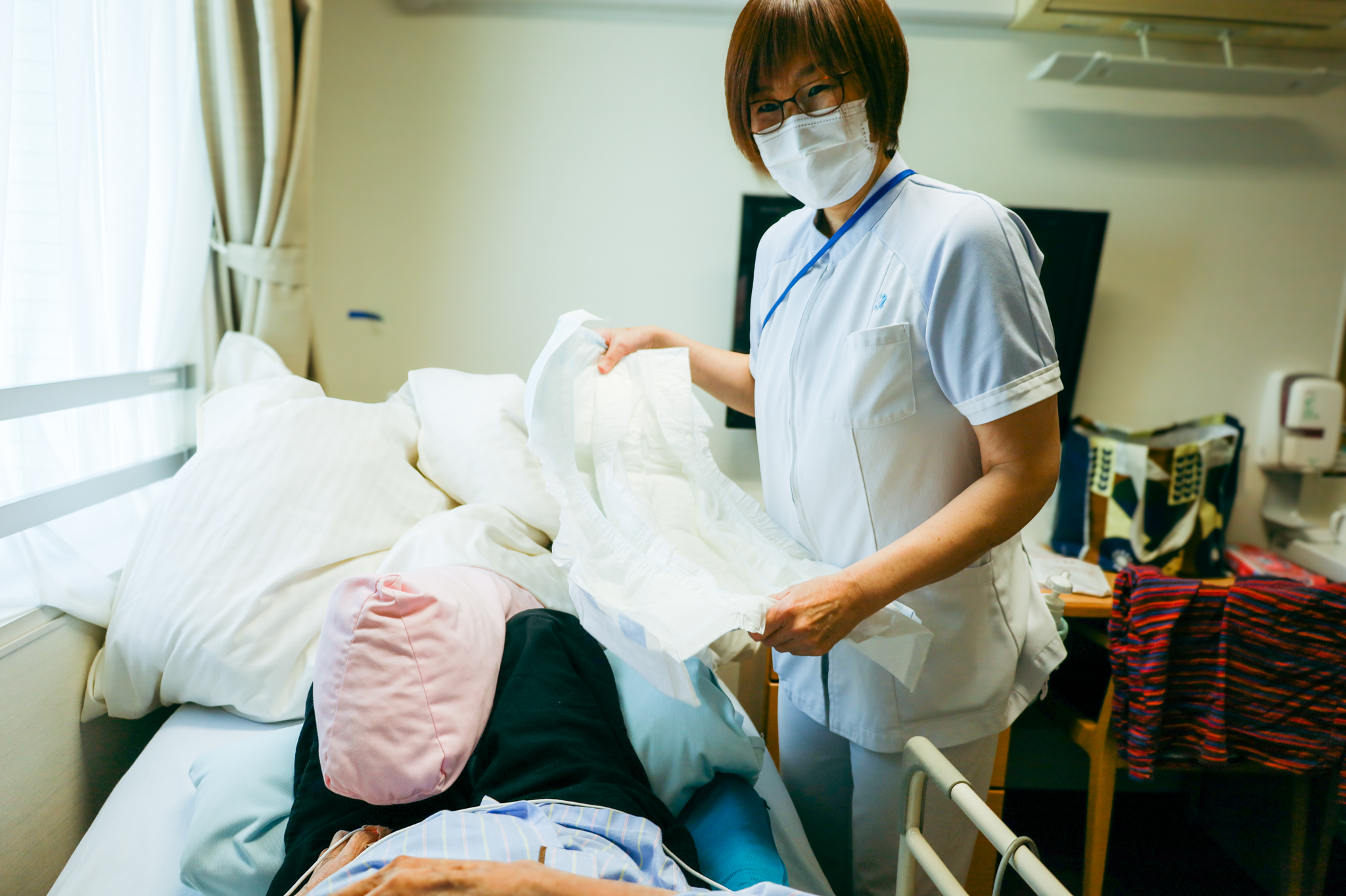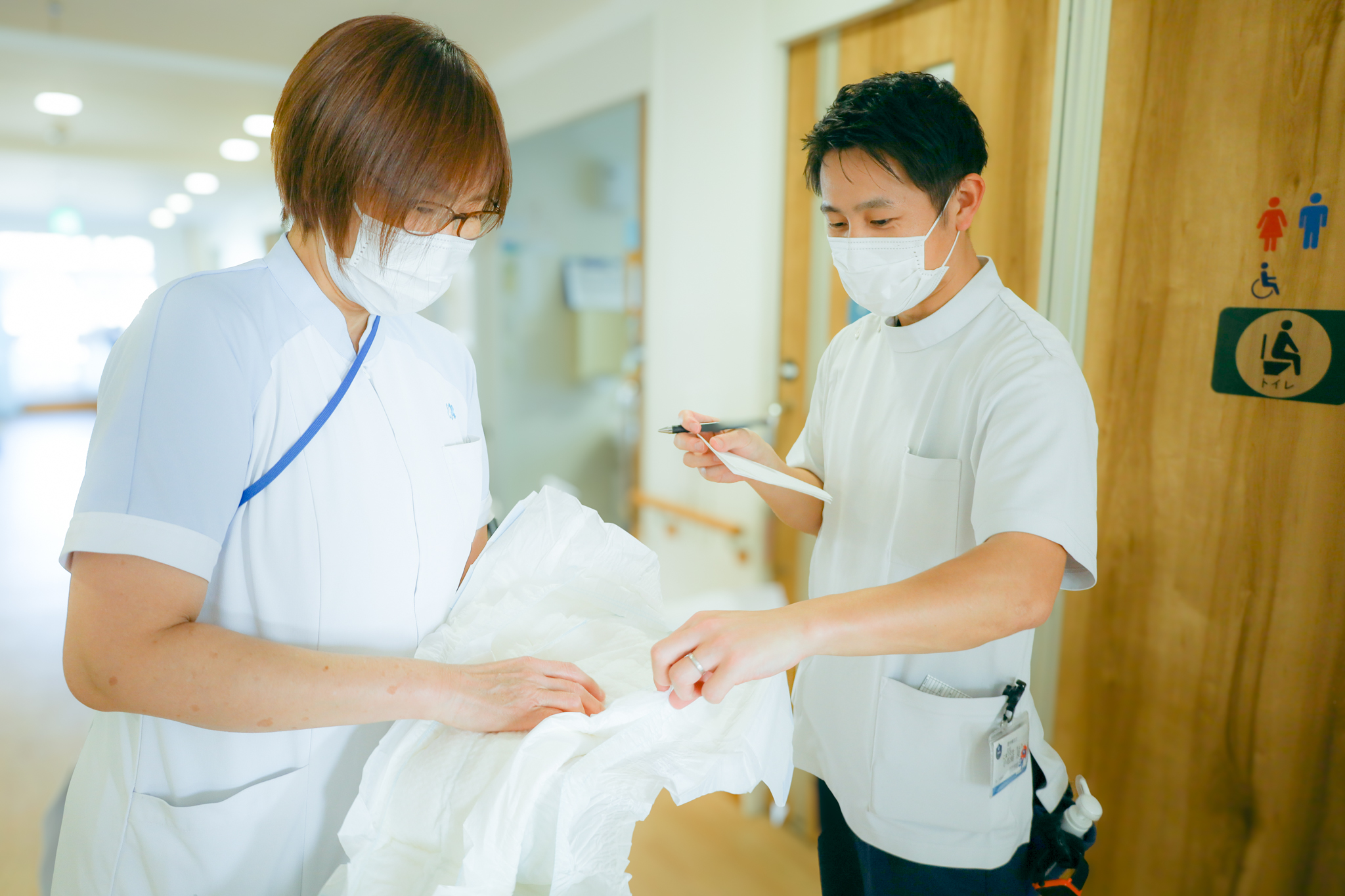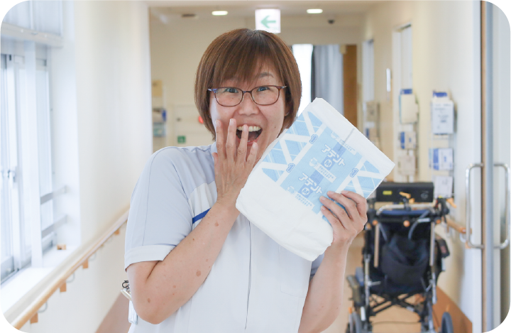 資格取得後は、オムツのスペシャリストとして、オムツの適切な使い方や排泄についてのアドバイス・提案・サポートを行い、患者様、ご家族、スタッフ、入院患者様の排泄ケアに幅広く活かしていきます。いつでもご相談お待ちしています!